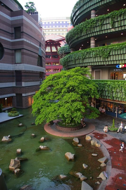 "博多運河城,強調人與街市的諧調融合關係是博多運河城特色,並且使用空間佈置的手法巧妙設計,突出表現這種人與街市的情節關係"