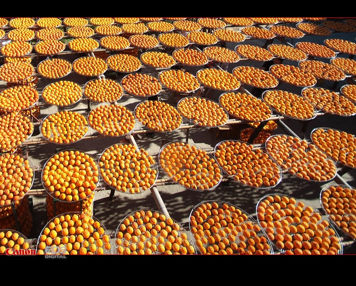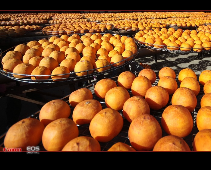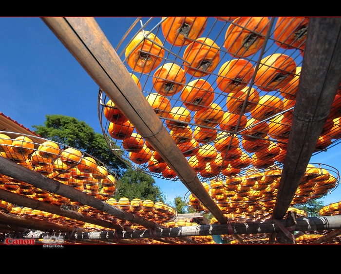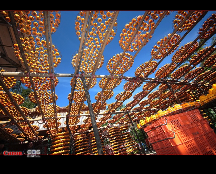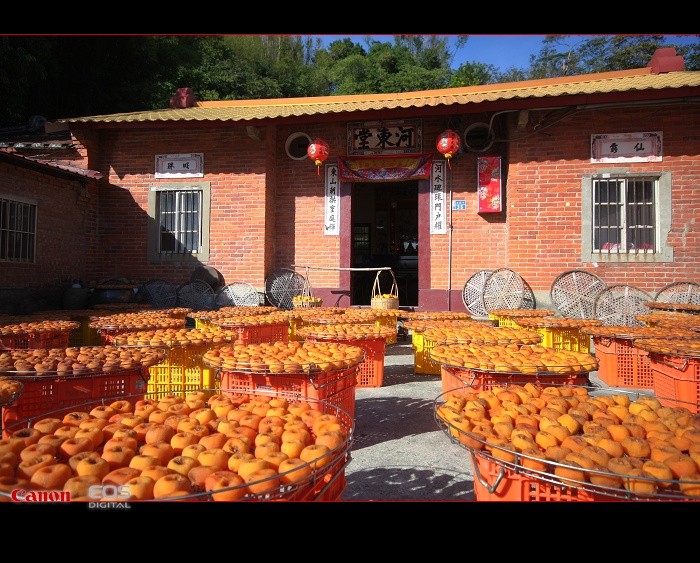 黃澄澄柿子,配上藍天白雲,紅磚瓦屋,